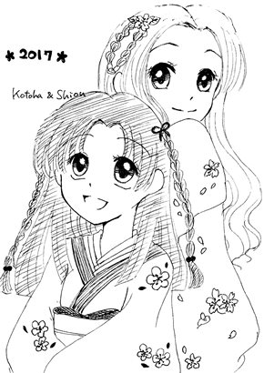 昨日はオリキャラことはの誕生日だったので昨日更新できたらよかったんですが昨日まで結構ばたばたしてたので紫音とセットで。和服描くの大の苦手なので最初は洋服で描いてたんですが、お正月らしく着物着せてみました。柄が適当なのはまあ置いといて、ことははともかく紫音はほぼ体が見えないのをいいことにかなり適当になってます(苦笑)服装は和服だけど髪型は現代っぽくしたつもり。モノクロですが割と気に入っています。