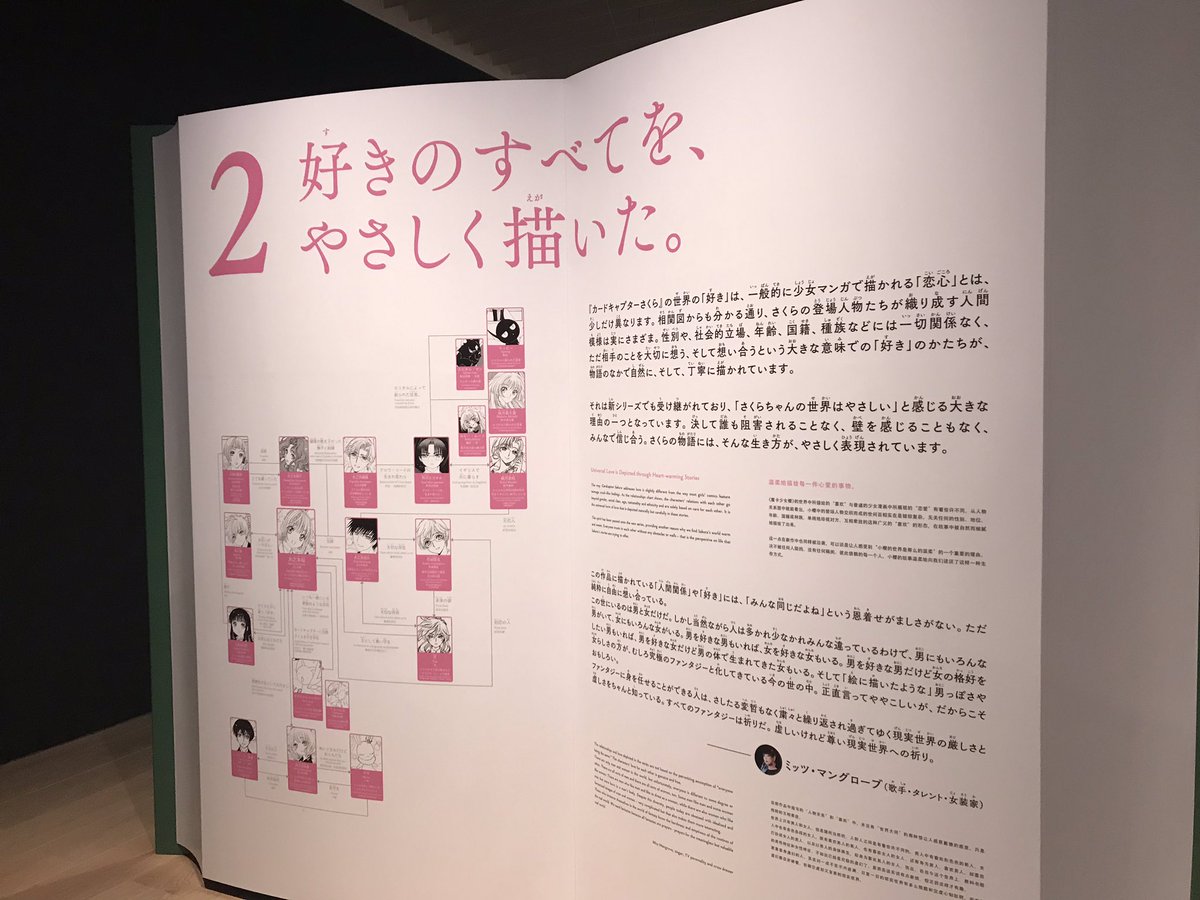 しかし「これは本当に人の手で描かれたのか・・・?」と思ってしまうほどの細かさでした。カラー扉とかほぼ修正あとないんですけど、原稿のほうは結構修正入ってたりするの面白かったです。やっぱりCLAMP先生もミスされるんだなと(←完璧超人なイメージだった)。口が描き直されてたり、手が書き足されてたり、効果音が消されてたり、人物ごと切り貼りされてるとこもあったり。お花とかは直接コマに描かれているところもあるけど、ほぼ切り貼り。知世ちゃんの髪のふわふわした感じもオールアナログ作業だからこその繊細さ。
