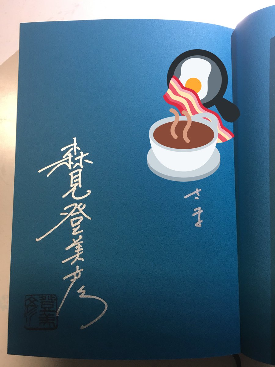 (ここで森見さんは急にそんなことを言われて困ったのか照れたのか分かりませんが、サインする手を止めて片手を頭に置いて頭頂部をこちらに見せられたので「言わなきゃよかったか・・・」と後悔)