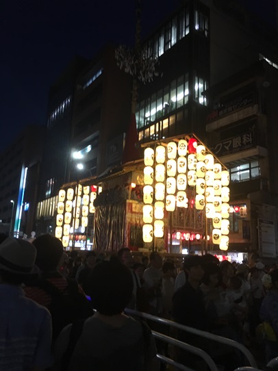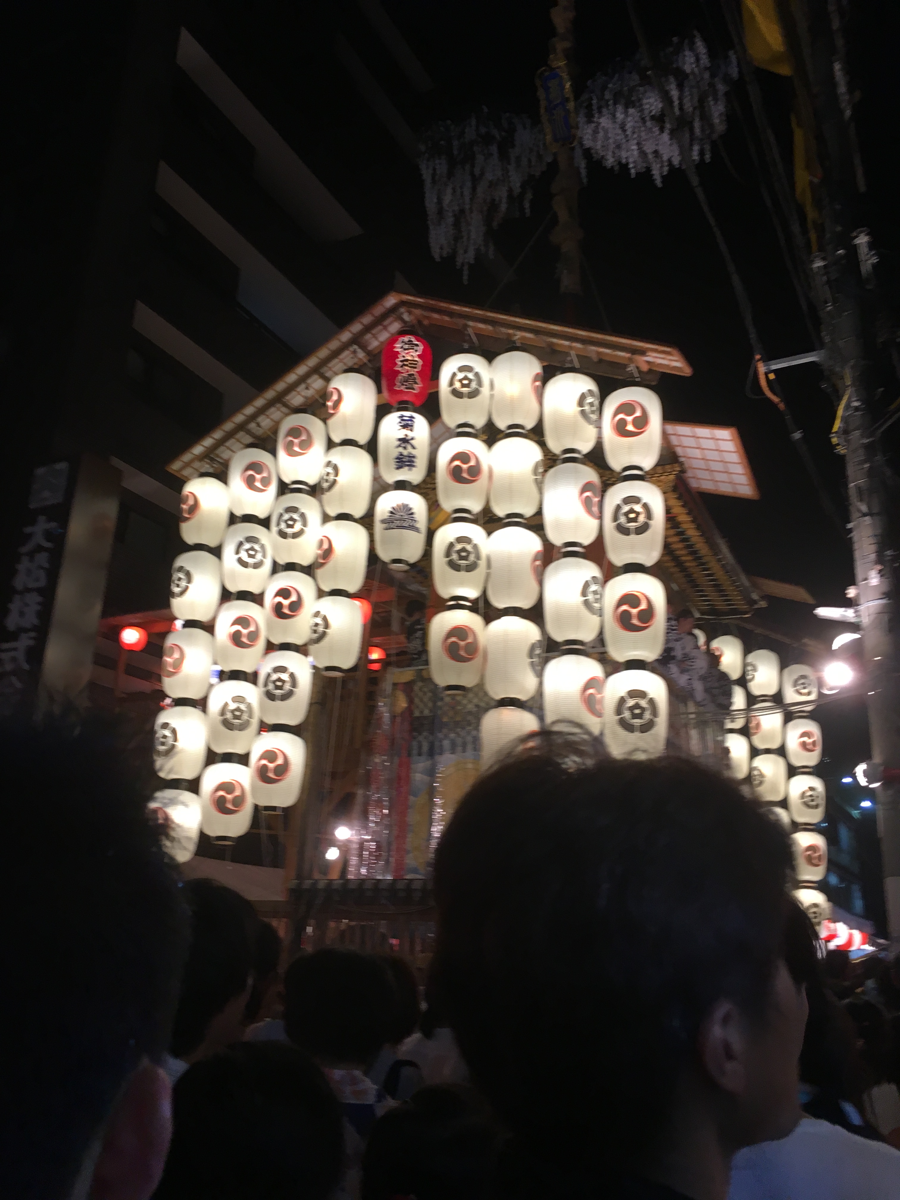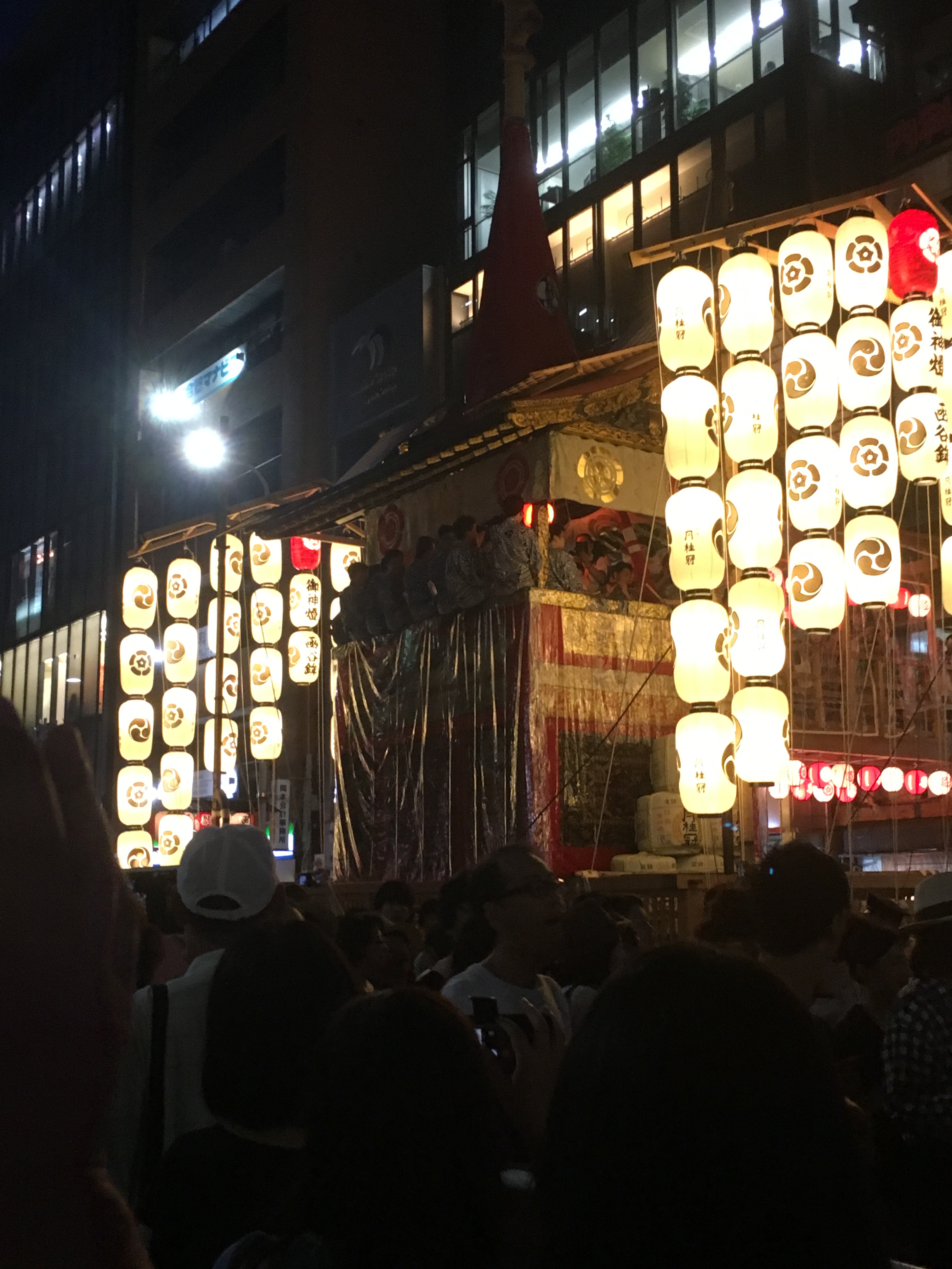 昼の鉾は毎年のように見てますが、夜の歩行者天国の時に行ったのは10数年ぶりか、20年ぶりか、もしくはもっとか、とにかく久しぶりでした。人混みの熱気とかすごかったですが前々から行きたいと思いつつ行けてなかったので満足。夜見るとまたテンション上がる。灯りもともってますし。