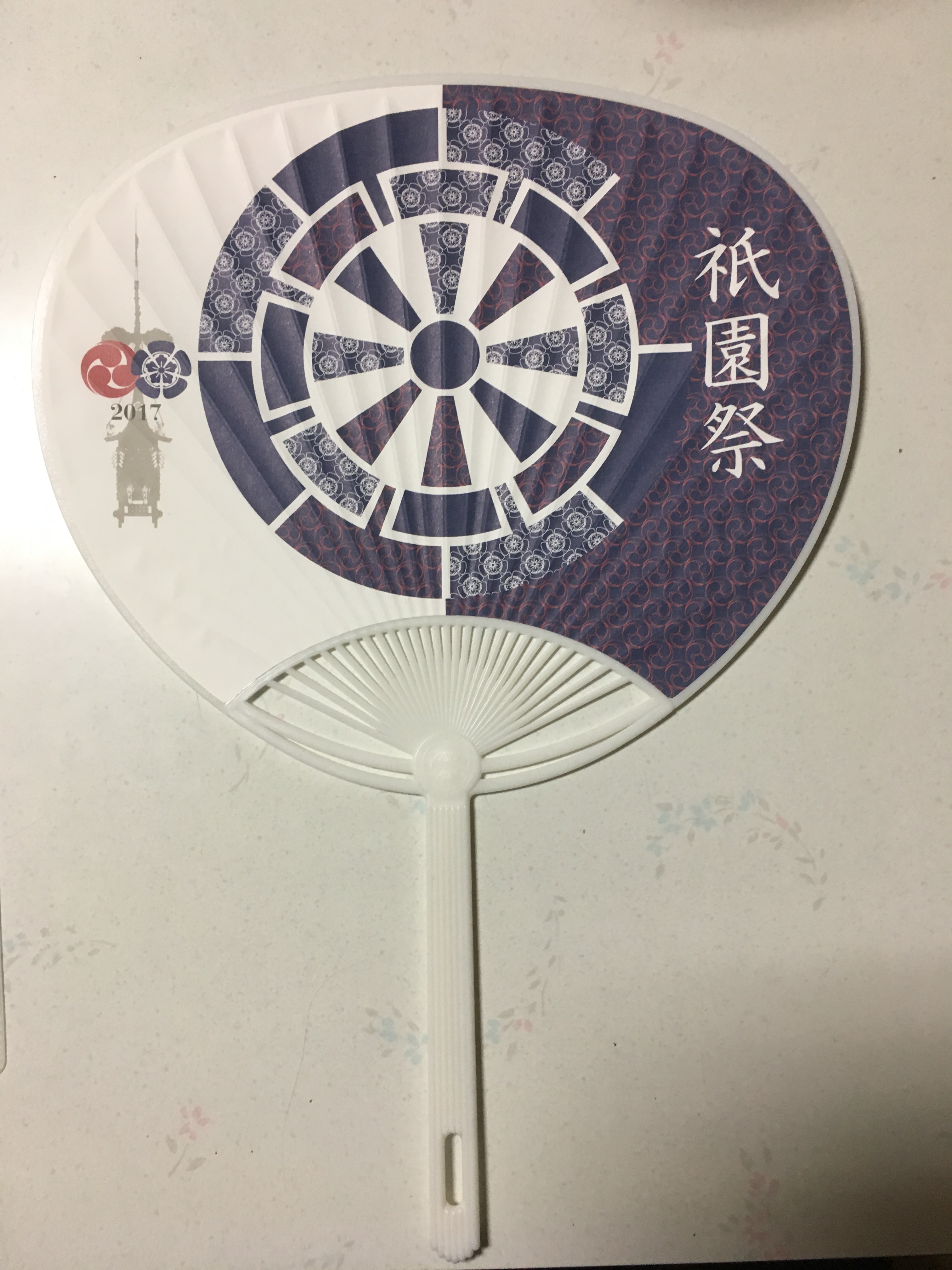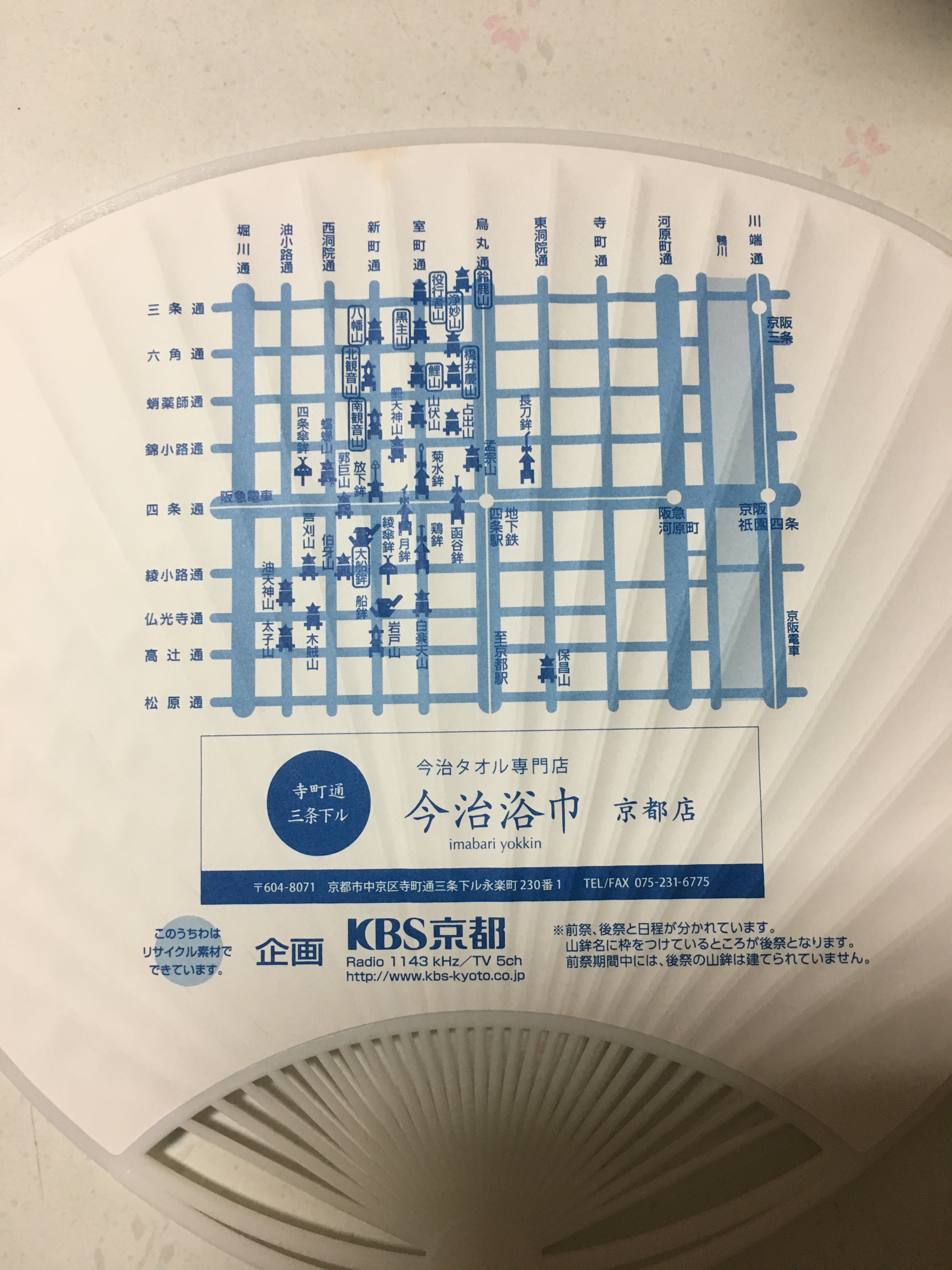 裏にはどこに何鉾や山が出ているかとか書かれていて便利。ただ夜にはあまり役に立ちませんでしたが・・・(そもそも人多くて自由に歩けない)。NHKで涼んでるときにモニターで鉾やら山やらの紹介されてた時はうちわ見ながら確認してました。汗だくになって帰りましたが楽しかった!