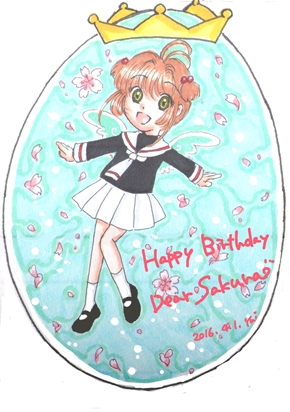 「中に桜が舞ってる羽根たまごとさくらちゃん」という感じで描きたかったんですが、中は青空っていうより水っぽいしたまごの形もいびつだし・・・;でも割と気に入ってます。スキャンの調子悪くて下のほう濁った感じになっちゃったけど。また機会があればリベンジしてみたい。