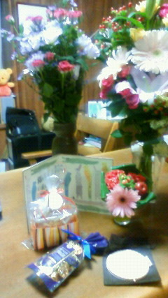 かなりボケててごちゃごちゃしてますが、画像はその時もらったお花、色紙、写真(その場で撮った)、お菓子、プレゼントだそうです。