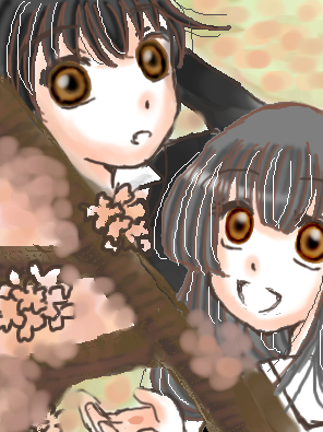 桜の木を見上げてる構図で描きたかったんですが、見事失敗しました(泣)桜の木って難しい!;背景のピンクの点々は地面に落ちてる花びらのつもり・・・です。何気に孝秋の体が半分ない(笑)