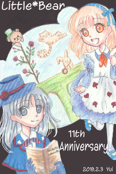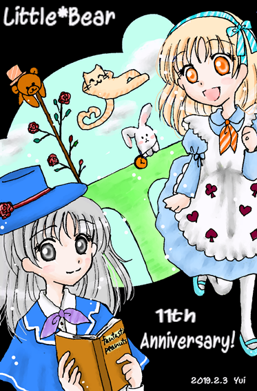 アリスなスフレと、アリスのお姉さんな奈津(2月3日は彼女の誕生日でもあるので描きたかった)。くま型に切り取られた不思議の国。奥にいるのは時計ウサギとチェシャ猫のつもりですが、なんかどちらも普通の猫とうさぎっぽくなりましたね(笑)