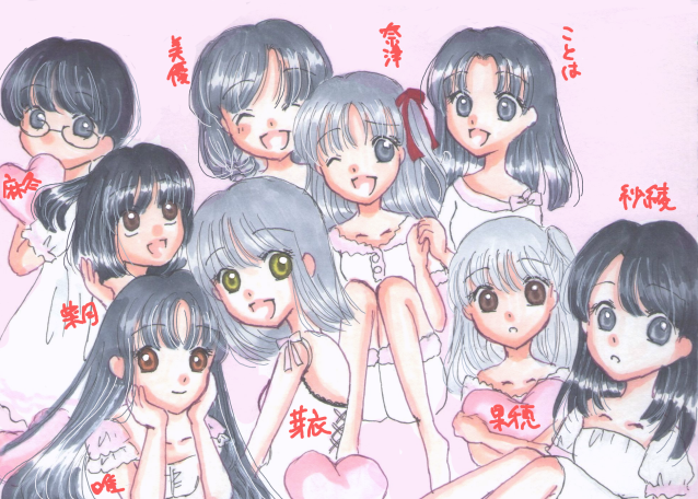 黒髪っ子縛りにしよう!と思いつき、グレー髪の黒髪か微妙な子も交じってますが数えてたら9人いてちょうど9周年だしいいかと思ってこれに。デジタル初めてな子とかそんな描いてない子とか色々詰めこんでます。9人もいるので配置も難しかった。