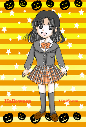 ハロウィンぽい制服があってもいいじゃないか!と思ったのが確か去年の10月末あたりで、どんなのにしようかとなんとなく考えていました。黒のセーラーブレザーにオレンジのチェックのスカートとデザインは気にいっていますが、チェックのスカートが上手く描けなくてあまり満足いく出来にはなりませんでした・・・。チェックどう描いていいのか分からないんだよ!苦手ならそれ早めに気づいとけよ私!これも素材にかなり助けられた1枚です(^^;)ちなみに3枚とも同じ作者の方のをお借りしました。ありがとうございました!