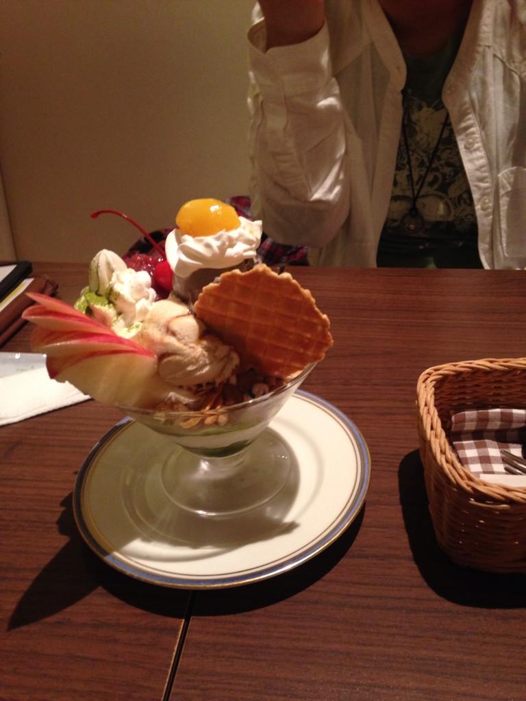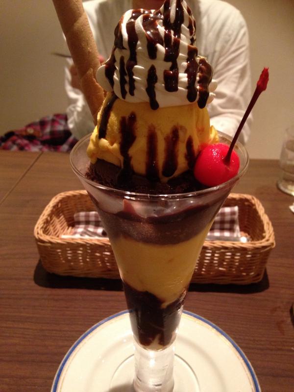 そのパフェというのが上の画像のなんですが左が私、右がGちゃんの(一緒に撮ろうとするとかぶって撮れないので移動してもらった)。これの前に軽くごはん食べてたのもあって結構食べるの大変でした。甘いのもそうだけどほとんどアイスなんですよこれ!もう1週間分くらいのアイス食べた気がするよ!途中からチョコレートの海(笑)になり、しょっぱいものが恋しくなりました。こんなことならごはんと一緒に持ってきてもらえばよかったか・・・。