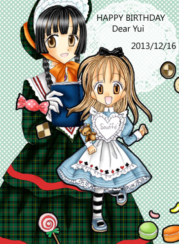 モカと一緒に今にも不思議の国へ飛びこんでいきそうなスフレがとっても可愛いですvvハートやトランプの柄モチーフなアリス服も新鮮で可愛いvアリスなスフレは以前私も描きましたが、イギリス人だけあってさすがアリス服着こなしてるなあと思いました(笑)