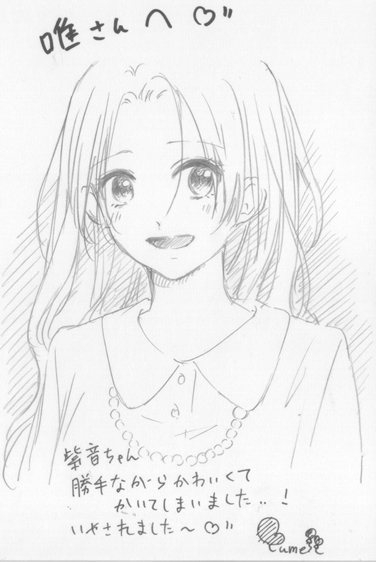 と思ってお手紙の裏にうちの紫音と一緒に紫音ちゃん描かせていただいたんですが、まさか描いてくださるとは!!